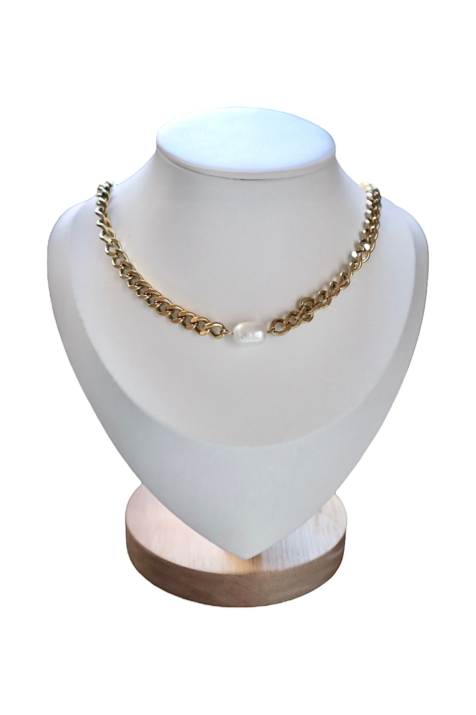 Un collier qui allie simplicité et éclat. La chaîne en acier inoxydable doré met en valeur une perle blanche lumineuse, subtilement nacrée, symbole d’élégance et d’harmonie.